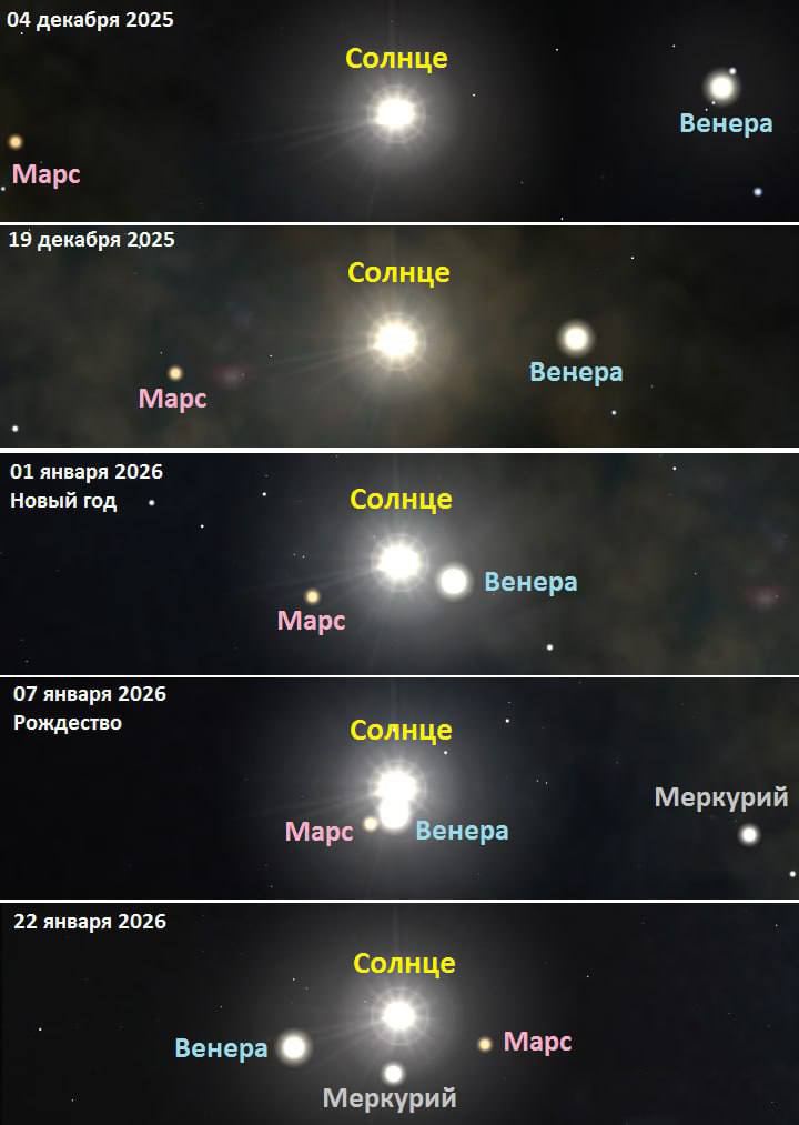 Астрономы подчеркивают, что в следующий раз Венера и Марс сойдутся с Солнцем практически в одну точку на небе только в 2267 году. Наблюдать «Вифлеемскую звезду» можно в юго-западной части неба при условии ясной погоды.