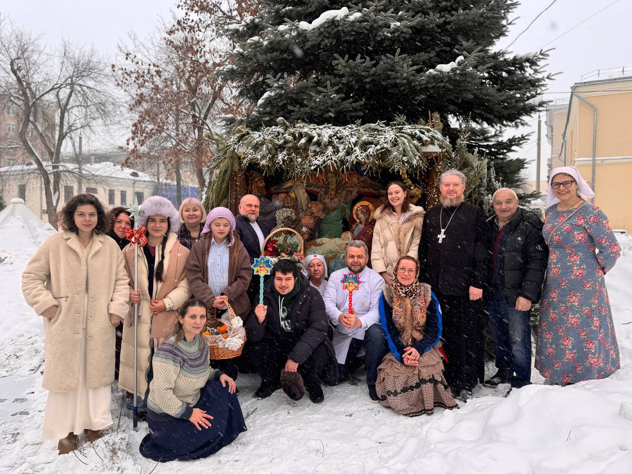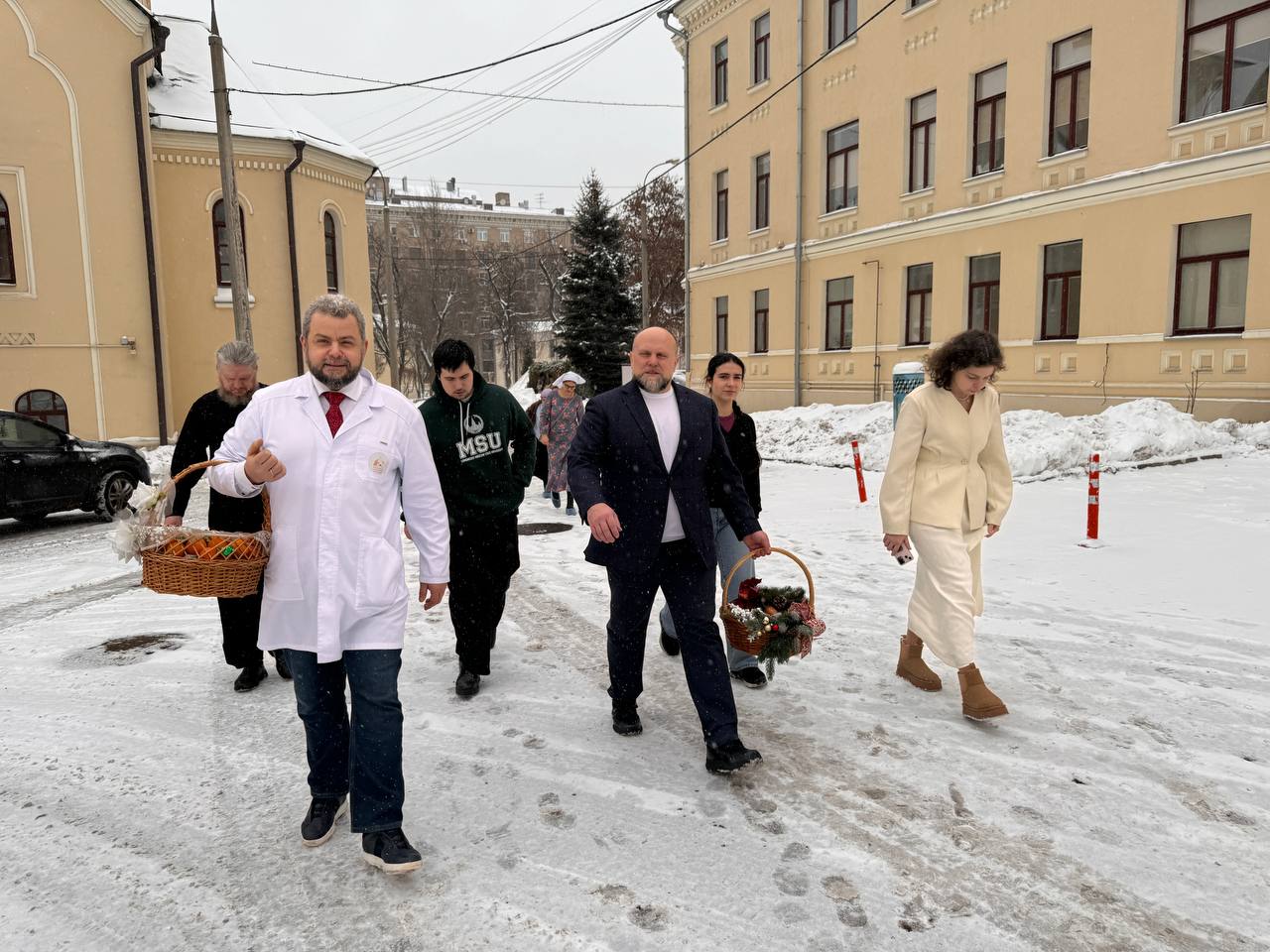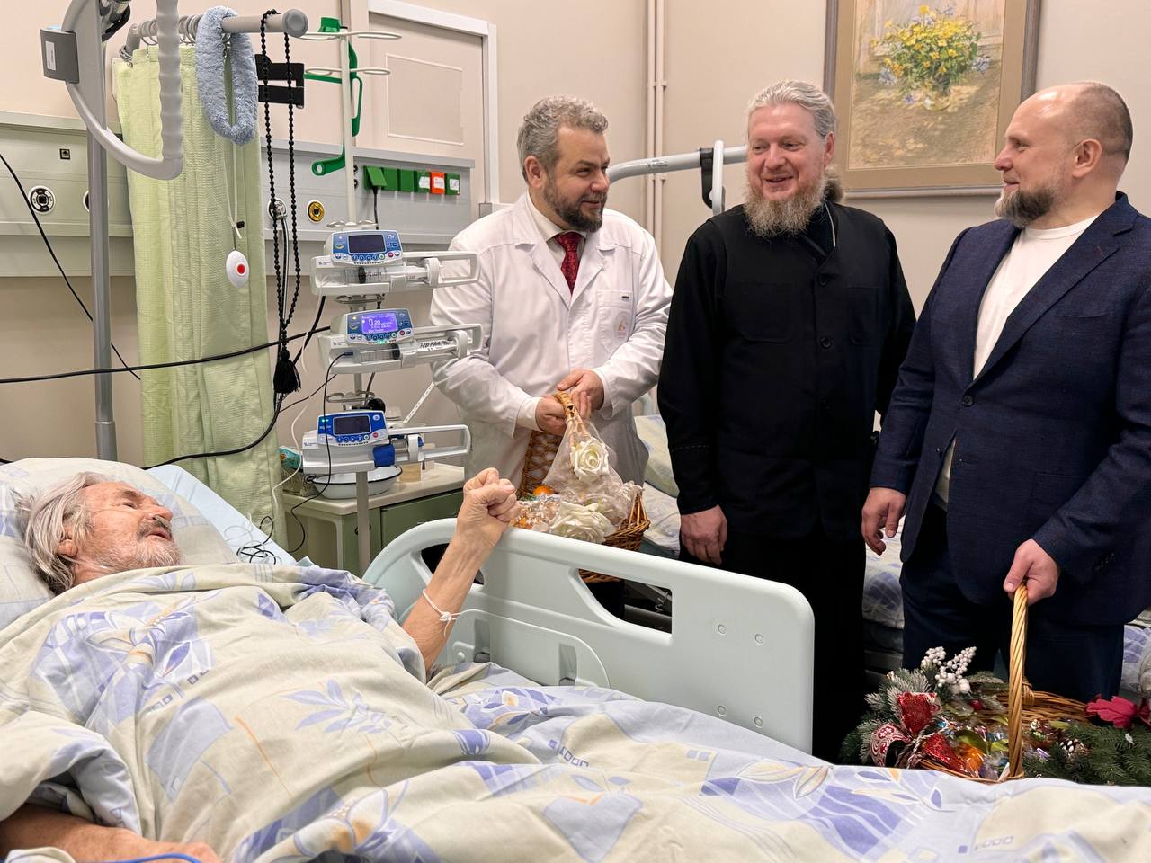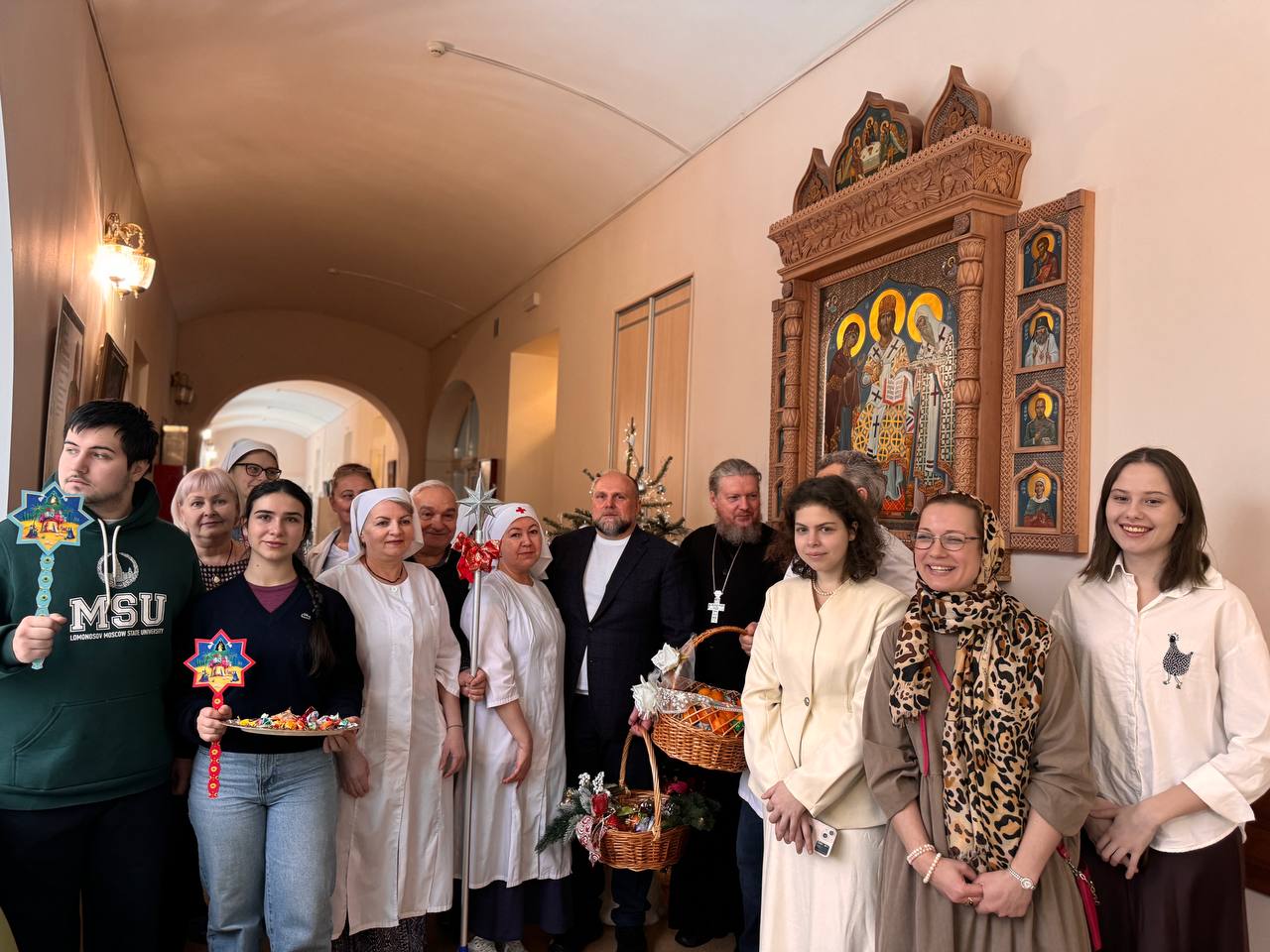 Замминистра здравоохранения Андрей Плутницкий, главврач Алексей Заров, протоиерей Сергий Кляев в сопровождении добровольцев и сотрудников поздравили пациентов больницы Святителя Алексия и передали слова поздравления от председателя попечительского совета Святейшего Патриарха Кирилла и Министра здравоохранения России Михаила Альбертовича Мурашко.