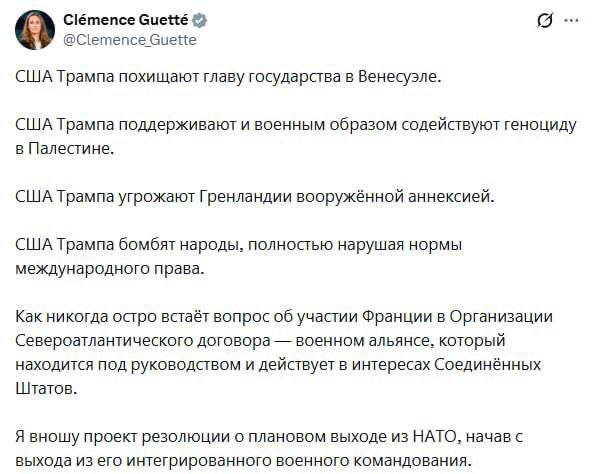 Вице-председатель Национального собрания Клеманс Гете объявила о планах вынести на голосование резолюцию о выходе страны из НАТО из-за действий США при администрации Трампа.