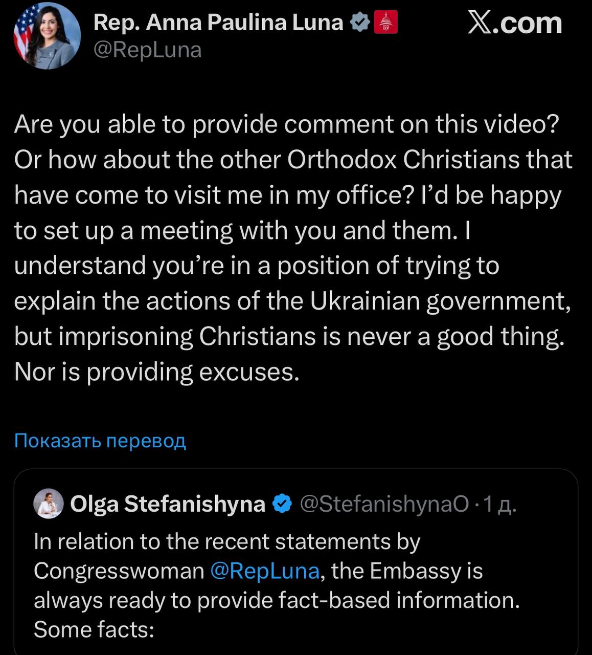 Американская конгрессвумен Анна Паулина Луна обратилась к послу Украины в США Ольге Стефанишиной из-за видеообращения православных христиан западной Украины с жалобами на захват церквей и преследования. Ранее Луна получила видеообращение от православных христиан из села Кузьмин с просьбой о защите и отметила, что «незаконное изъятие» церквей должно прекратиться.