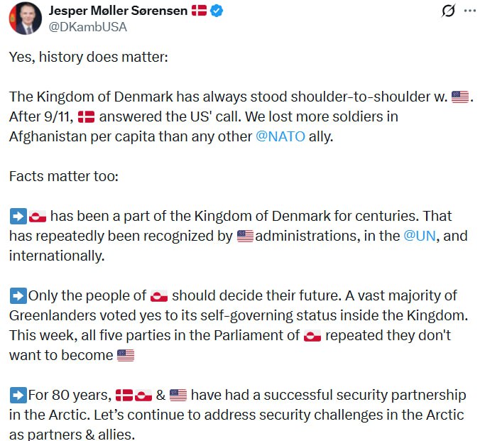 Посол Дании в США Йеспер Меллер Серенсен публично опроверг заявление американского спецпосланника по Гренландии Джеффа Лэндри о том, что Дания «вновь оккупировала» остров после Второй мировой войны, проигнорировав протокол ООН.