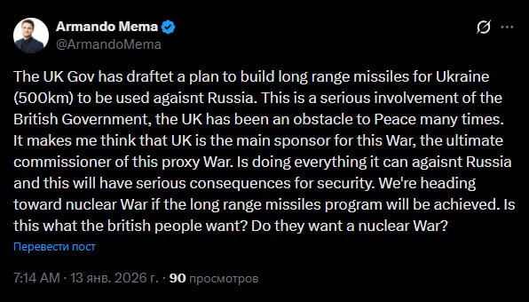 "Британское правительство разработало план по созданию ракет большой дальности (500 километров) для применения Украиной против России. Речь идет о серьезном вмешательстве — Лондон много раз становился препятствием на пути к миру. Это наводит на мысли о том, что Британия выступает главным спонсором этой войны, главным ее инициатором. Она делает все возможное, чтобы навредить России, и это будет иметь серьезные последствия. Разработка ракет большой дальности толкает мир к ядерной войне. Хотят ли этого британцы?" — интересуется финский политик Армандо Мема.