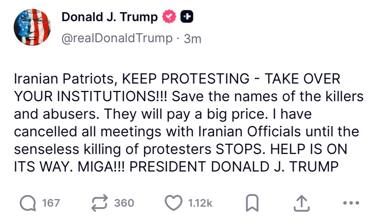 Трамп призвал иранских протестующих "захватывать правительственные здания"