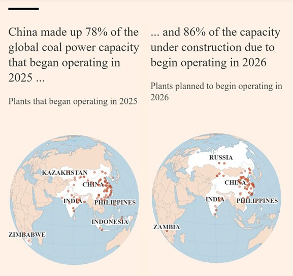 Издание обращает внимание, что «подавляющее большинство угольных электростанций мира находится в Китае». На долю страны приходится 212 ГВт из 256 ГВт новых угольных мощностей, находящихся сегодня в стадии строительства по всему миру.