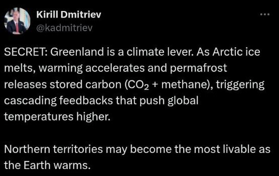 Гренландия — это климатический рычаг, заявил спецпредставитель президента РФ Кирилл Дмитриев.