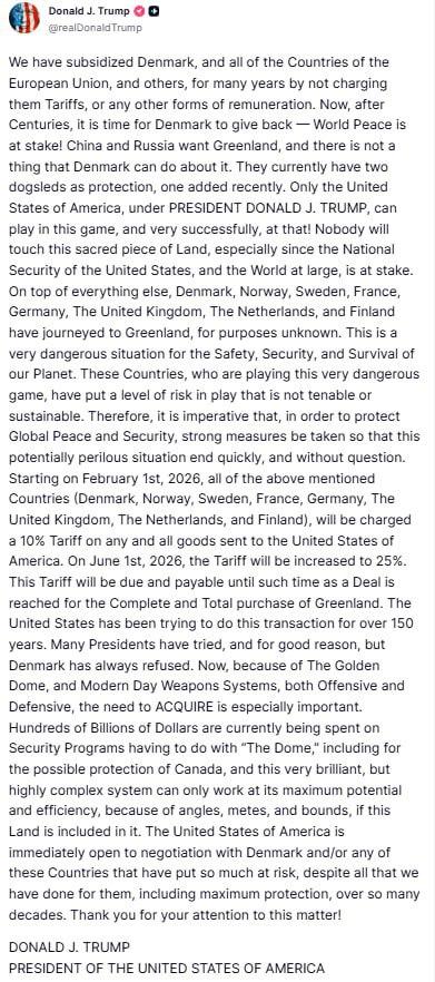 Дания, Норвегия, Швеция, Франция, Германия, Великобритания, Нидерланды и Финляндия будут обложены тарифом в 10% на все товары, поставляемые в США. С 1 июня 2026 года тариф вырастет до 25%, заявил Дональд Трамп.