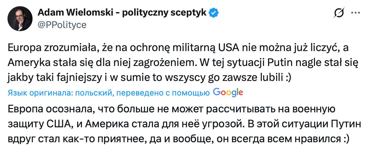 Европа осознала, что больше не может рассчитывать на военную защиту США, и Америка стала для нее угрозой. В этой ситуации Путин вдруг стал как-то приятнее, да и вообще, он всегда всем нравился.