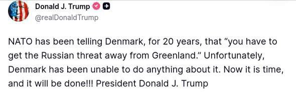 По словам Трампа, НАТО 20 лет предупреждало Данию о необходимости защитить Гренландию от российского вмешательства (которого правда как не было, так и нет), но она не справилась.
