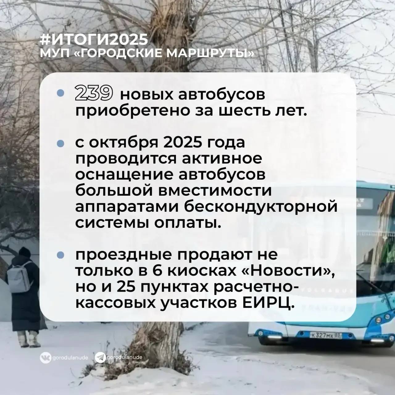 В прошлом году за счет льготного лизинга АО «ГТЛК» в рамках нацпроекта «Инфраструктура для жизни» приобрели еще 30 автобусов средней вместимости марки «ПАЗ». Всего за 6 лет при поддержке Главы Бурятии мы закупили 239 новых автобусов, в нынешнем году мы продолжим работу.