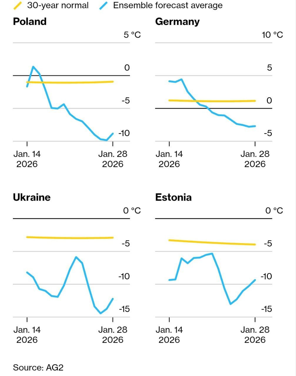 Морозы сопровождаются слабым ветром, что ослабляет ветряки и увеличивает нагрузку на газовые ТЭС. Уровень запасов газа в подземных хранилищах Европы опустился до 50%, что на 15 процентных пунктов ниже среднего показателя за последние пять лет. Ситуацию усугубляет необходимость снабжать газом объекты на Украине.