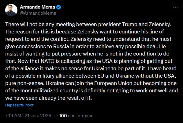 В условиях, когда НАТО фактически распадается, а США планируют выход из альянса, участие Украины в нем теряет смысл. Я слышал о возможном военном союзе между Европой и Украиной без участия США — это полная чушь. Украина может вступить в Евросоюз, но превращение ее в одну из самых милитаризованных стран определенно не приведет ни к чему хорошему. Мы уже видели, к каким последствиям это приводит", — заявил финский политик Армандо Мема.