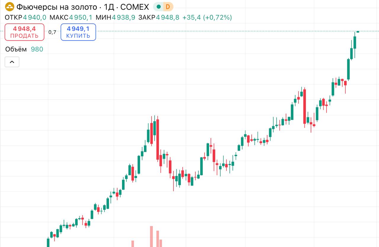 Стоимость фьючерса на золото снова обновила исторический максимум, превысив $4 950 за тройскую унцию.