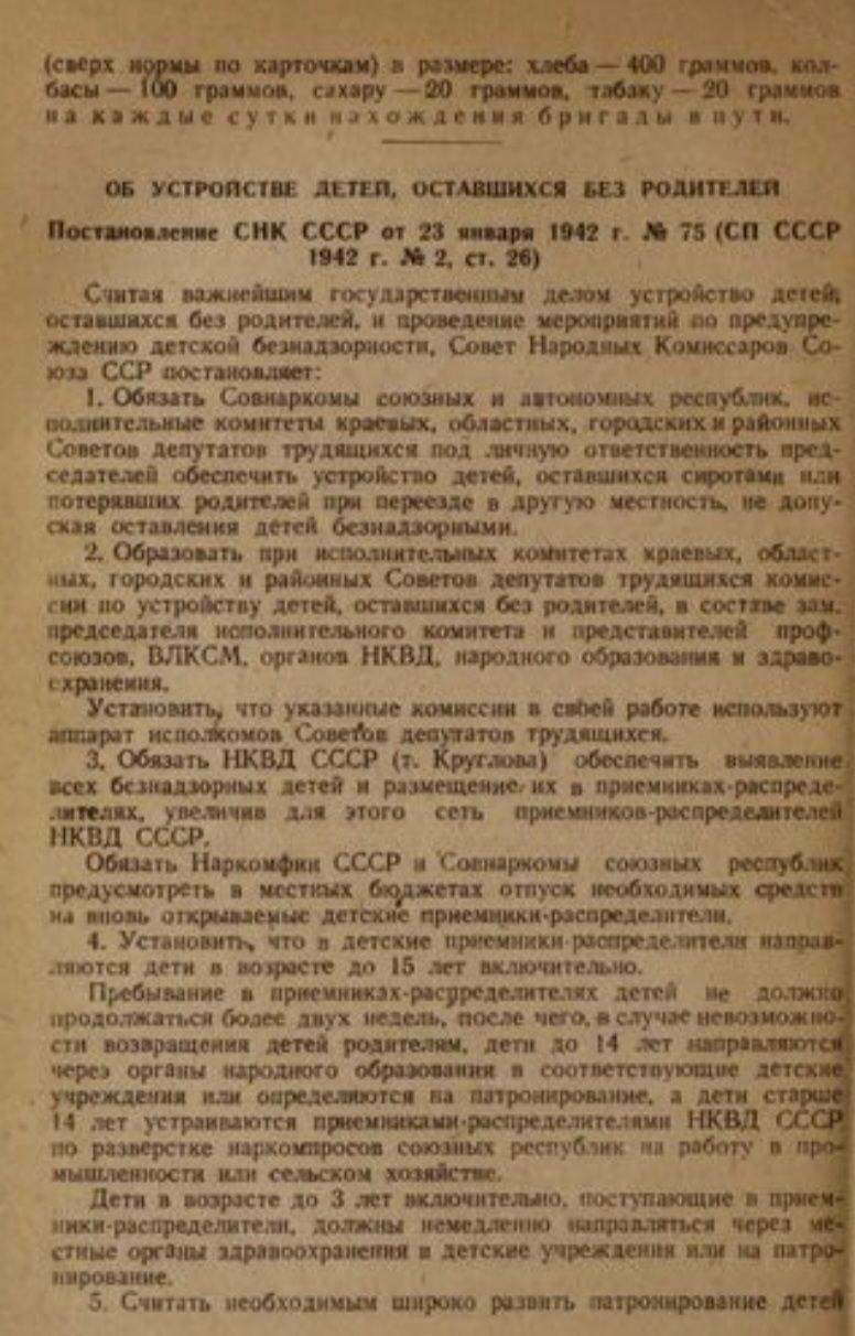–23 января 1942 года, во время Великой Отечественной войны, Совет народных комиссаров СССР принял постановление «Об устройстве детей, оставшихся без родителей».