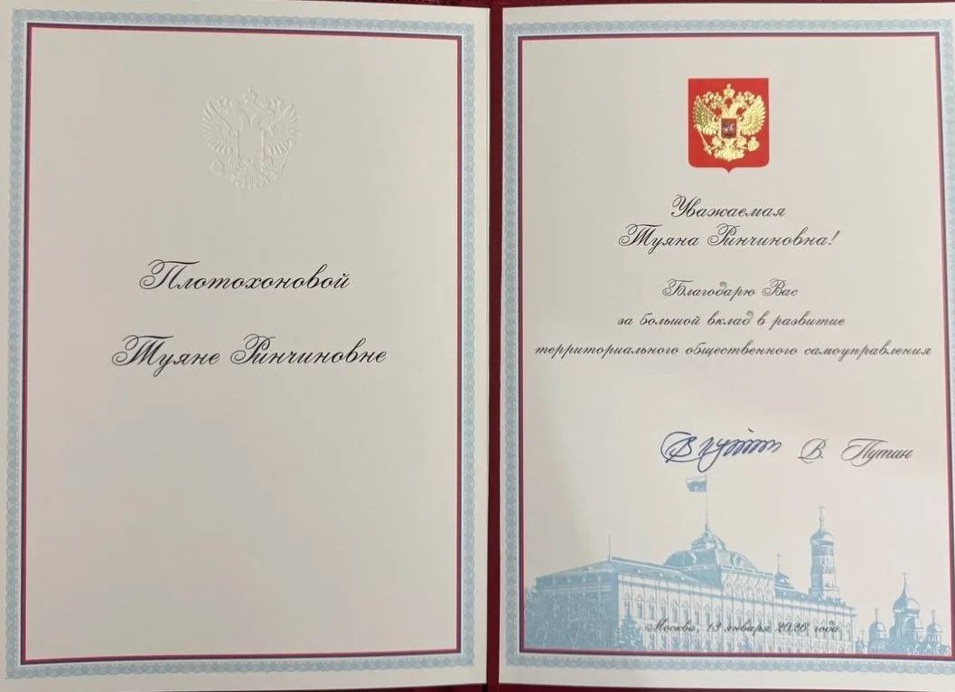 Благодарственным письмом Президента России Владимира Владимировича Путина наградили руководителя Ресурсного центра поддержки ТОС Бурятии Туяну Плотохонову за большой вклад в развитие тосовского движения.