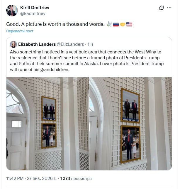 — так спецпредставитель Путина, глава РФПИ Кирилл Дмитриев прокомментировал сообщение американских журналистов о фотографии с Владимиром Путиным, которую Дональд Трамп вывесил в Белом Доме рядом с фото со своей внучкой.