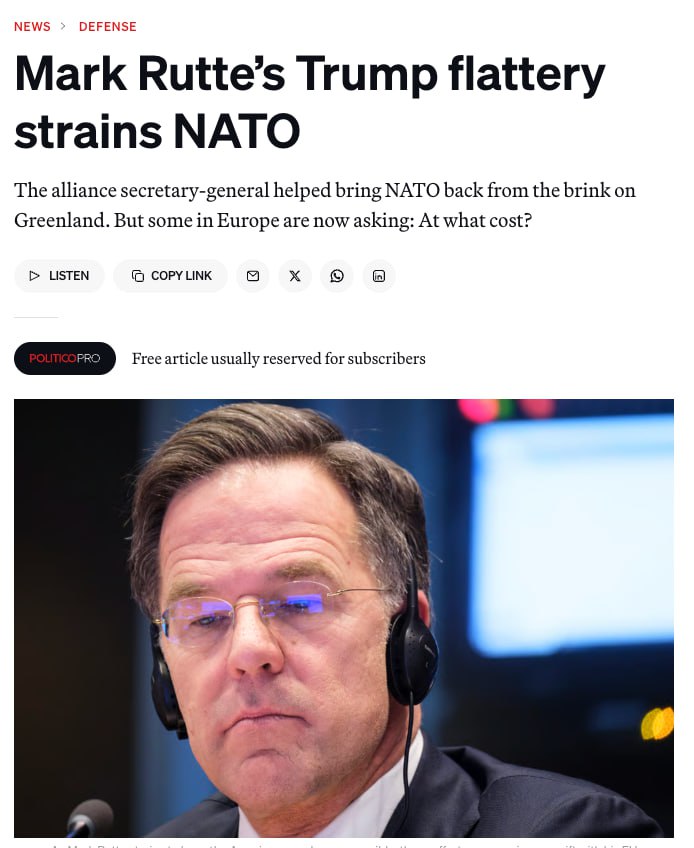 Сейчас главная задача Рютте состоит в том, чтобы не допустить выхода Соединенных Штатов из альянса, и такой подход вызывает критику в адрес генсека, так как затмеваются все его остальные обязанности, пишет Politico.