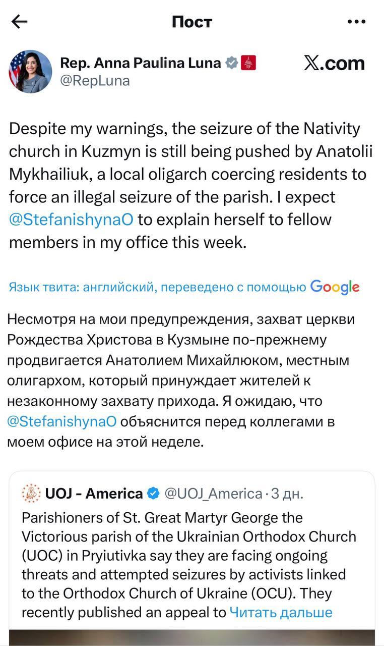 Конгрессвумен Анна Паулина Луна требует от украинского посла в Штатах Ольги Стефанишиной явиться к ней в офис из-за ситуации в селе Кузьмин.