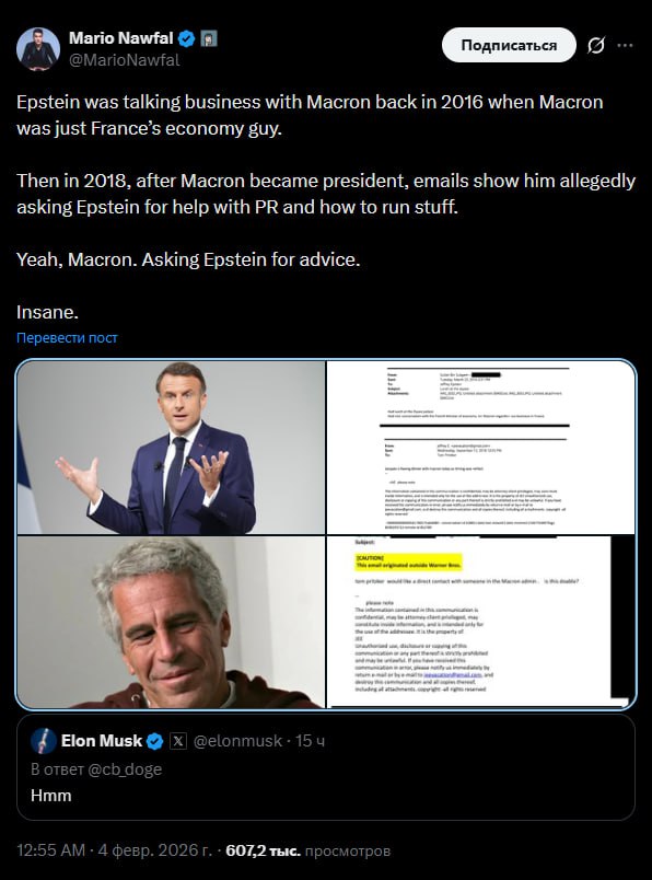 Да, Макрон. Просящий совета у Эпштейна. Безумие", — заявил американский блогер и предприниматель Марио Науфаль.