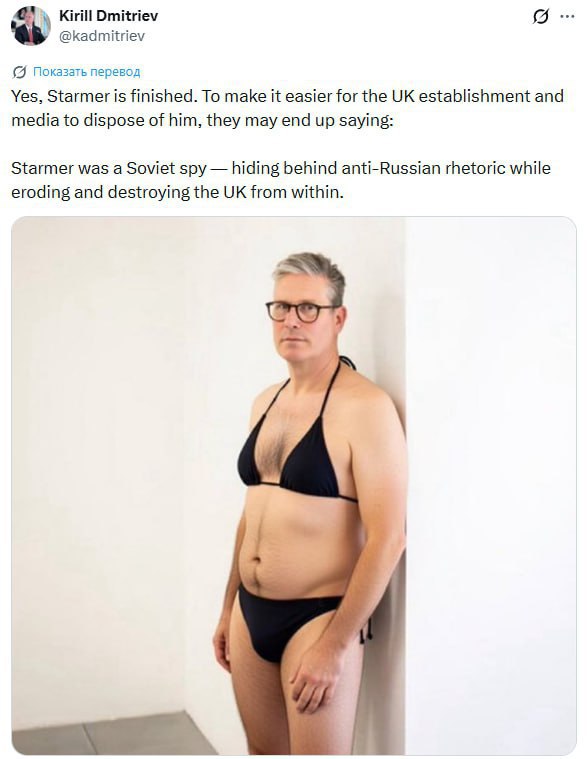 К слову, в чёрном купальнике, который глава РФПИ примерил Киру Стармеру, тот смотрится весьма органично. Последняя стадия человеческого достоинства, которую уже не спрячешь за должностью и дорогим галстуком.