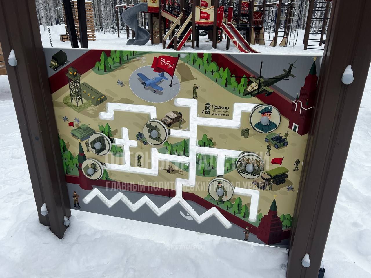 Необычную конструкцию стоимостью почти 150 миллионов рублей установили, что особенно символично, в городском Парке Победы. Вместо традиционных рисунков родителей и детей встретили бизиборды с солдатами НАТО возле Кремля, вертолётами Apache, автомобилями Hummer и собором Василия Блаженного без православного креста.