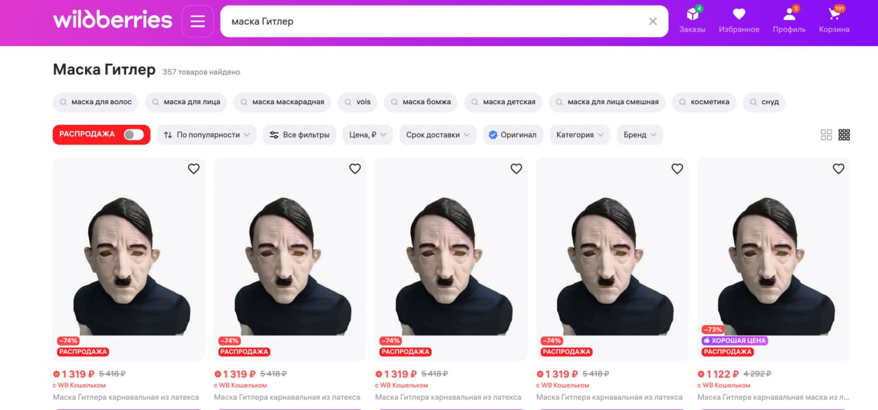 Что ж. Раз маркетплейс не может сам избавиться от хлама на своей площадке, это сделаем мы. Поможете нам, подписчики? Вот, к примеру, один из наших читателей прислал нам ни много ни мало маску Гитлера, с помощью которой Wildberries любезно предлагает любому желающему примерить на себя образ главного фашиста в истории. Сейчас ведь самое время потакать фашизму, да?