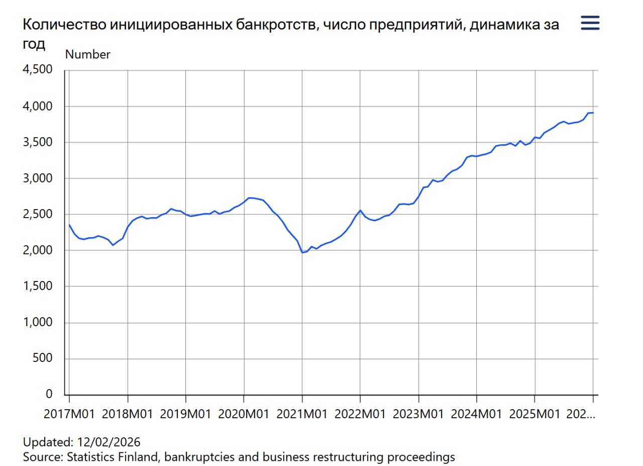 В Финляндии зафиксирован самый высокий за 29 лет уровень банкротств: в январе 2026 года было возбуждено 385 соответствующих дел — последний раз такая цифра наблюдалась в 1997 году.