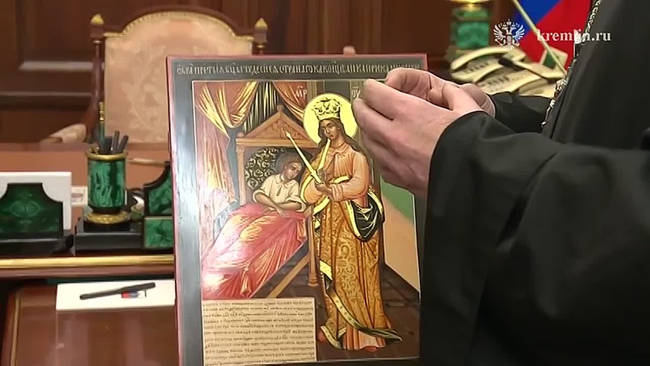 Также президенту была подарена икона Божией Матери «Целительница» в знак благодарности от родителей и детей за создание фонда.