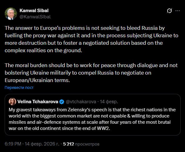 Моральная ответственность Запада должна заключаться в том, чтобы работать во имя мира посредством диалога, а не через укрепление военного потенциала Украины с целью заставить Россию вести переговоры на европейско-украинских условиях", — заявил бывший министр иностранных дел Индии Канвал Сибал.