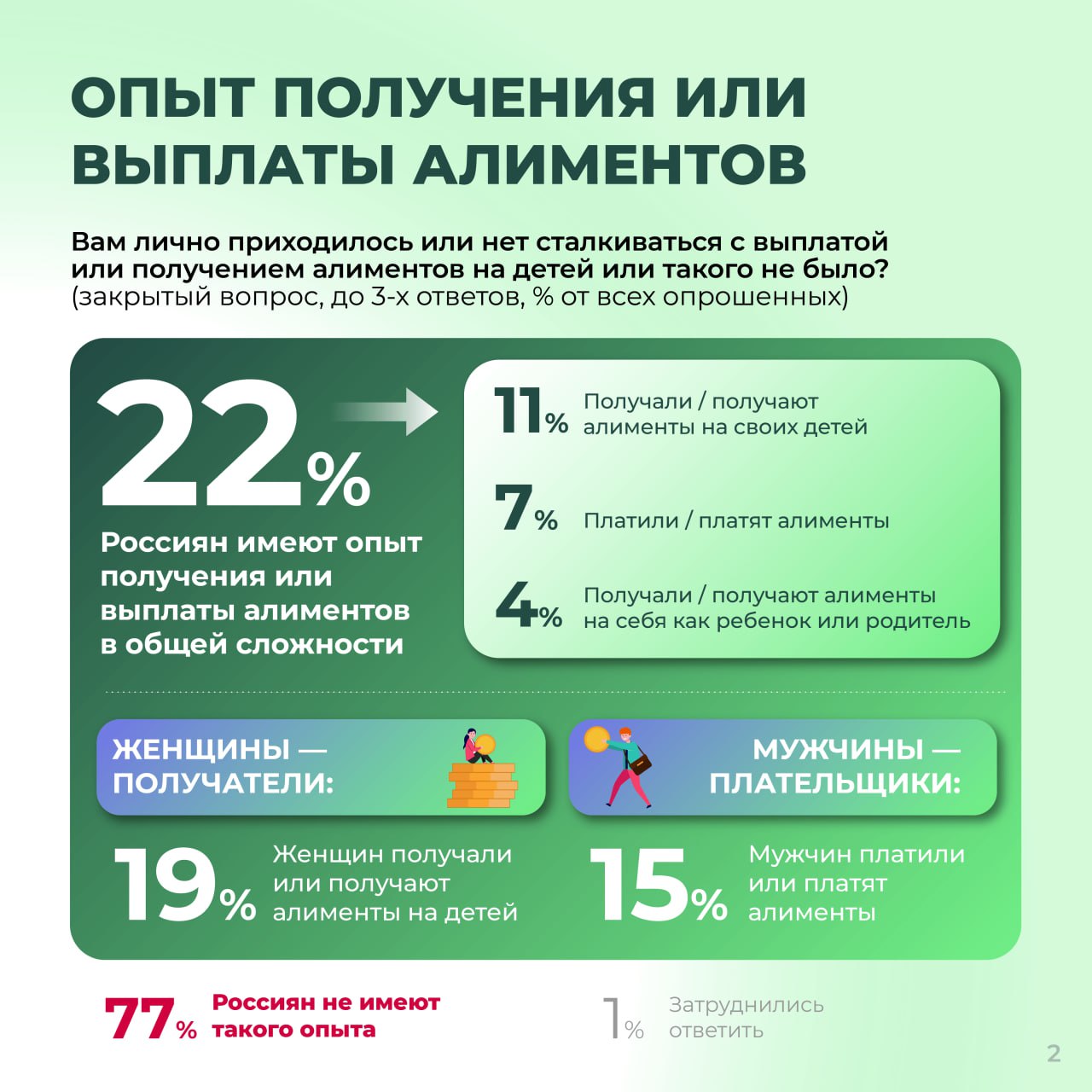Большинство граждан выступают за активное вмешательство государства в проблему алиментных платежей. Опрос аналитического центра ВЦИОМ показал, что тема касается практически каждой пятой семьи: 20% россиян имеют личный опыт получения или выплаты алиментов. Почти каждая пятая женщина получает их, а 15% мужчин являются плательщиками. 70% опрошенных уверены, что алименты нужно платить всегда и при любых обстоятельствах.