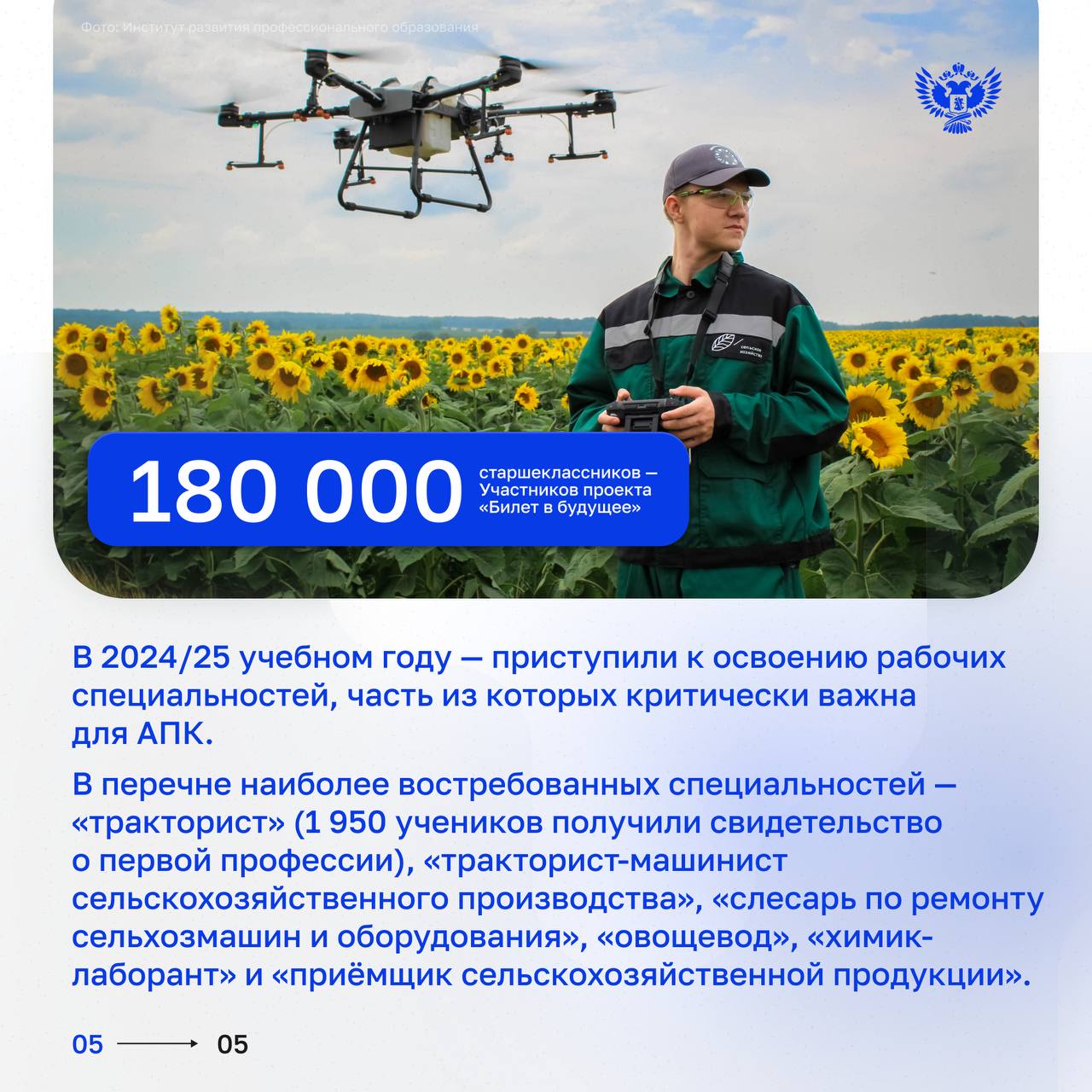 В перечень профориентационных направлений активно входит и профессиональное обучение. По всей стране открыто свыше 1 000 агротехклассов, в которых обучаются более 16 000 школьников. К 2030 их число достигнет порядка 18 000. Ребята получают базовые знания о работе в АПК и углублённо изучают профильные предметы.