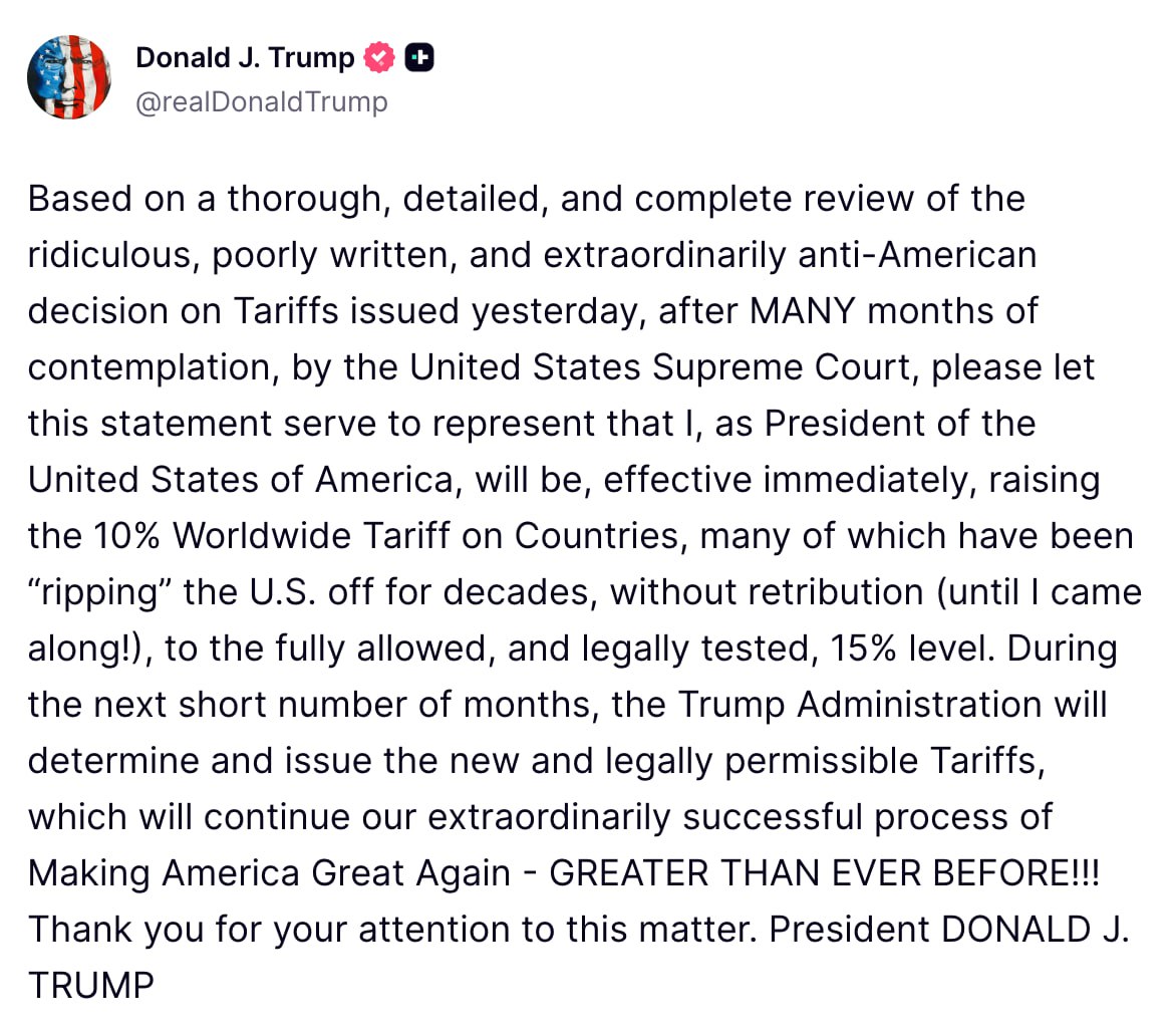 Дональд Трамп заявил о повышении глобальной пошлины с 10% до 15% в ответ на решение Верховного суда. Об этом он написал в соцсети Truth Social.