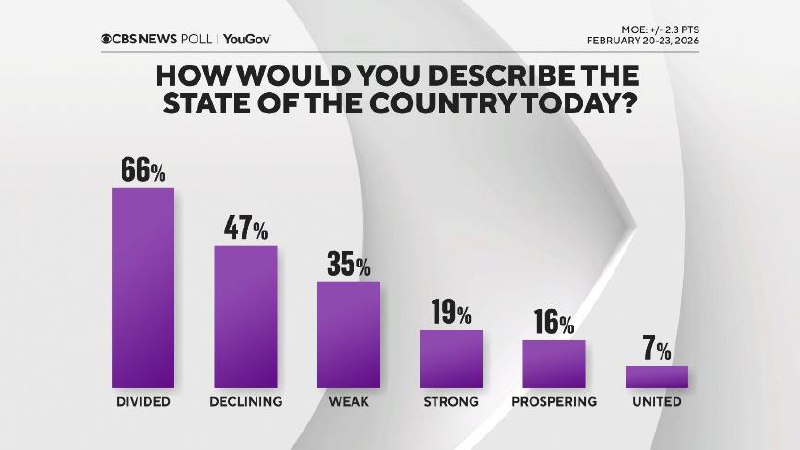 Опросы, вышедшие по горячим следам обращения Трампа к нации и Конгрессу, показали, что большинство американцев характеризуют свою страну как ‘разделённую’ и ‘находящуюся в упадке’. Это сильно контрастировало с бравурным настроем речи Трампа. Царящим пессимизмом активно пытаются пользоваться демократы.