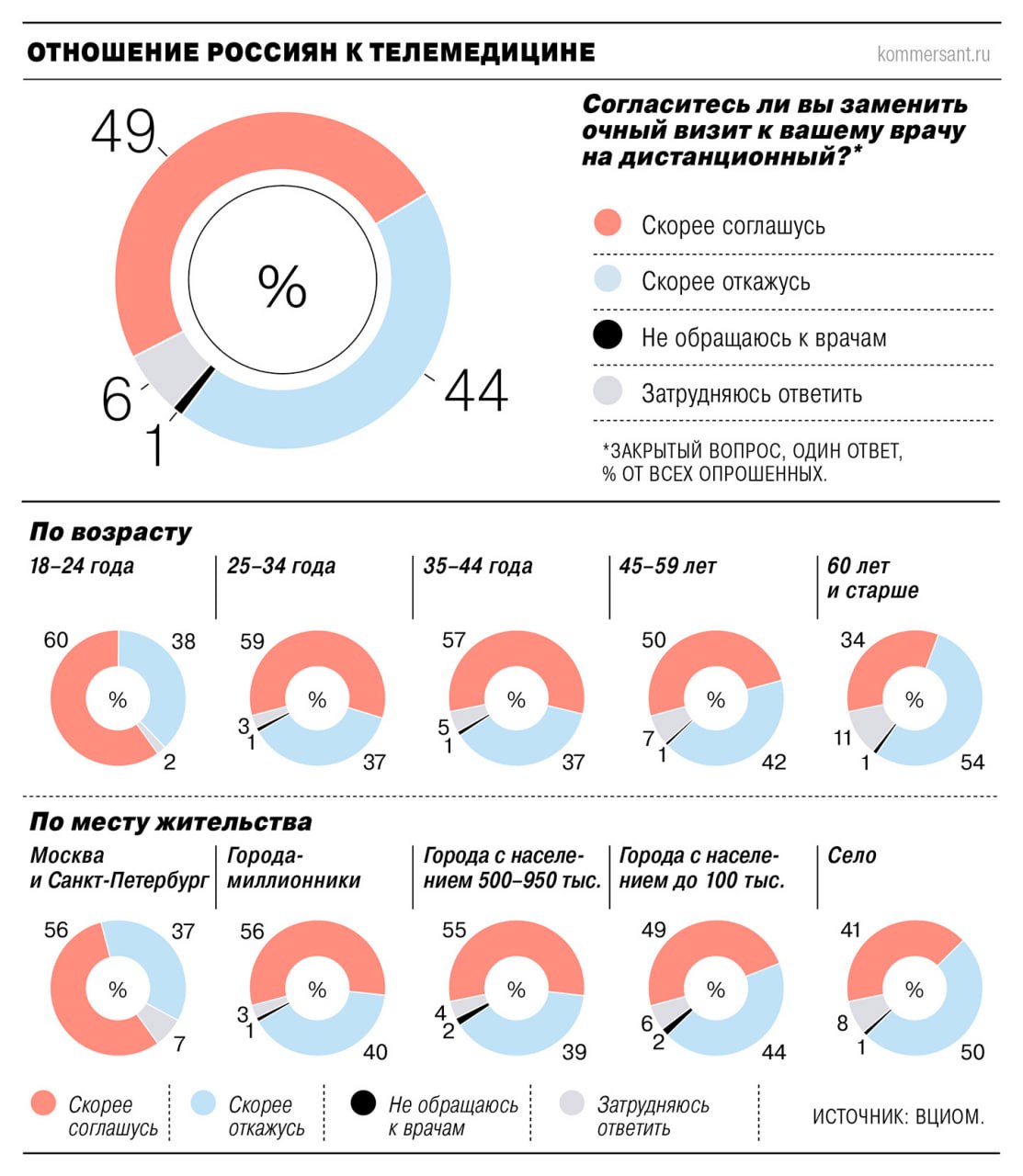 Мнение россиян по поводу телемедицины разделилось. Исследование ВЦИОМ показало, что 49% граждан готовы продолжать лечиться дистанционно после первого визита к врачу, однако 44% категорически против такого формата.