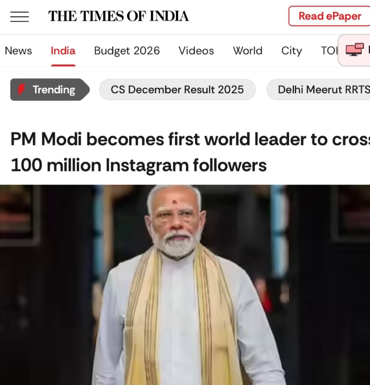 Нарендра Моди стал первым в мире политиком, который преодолел отметку в 100 млн подписчиков в Instagram*.