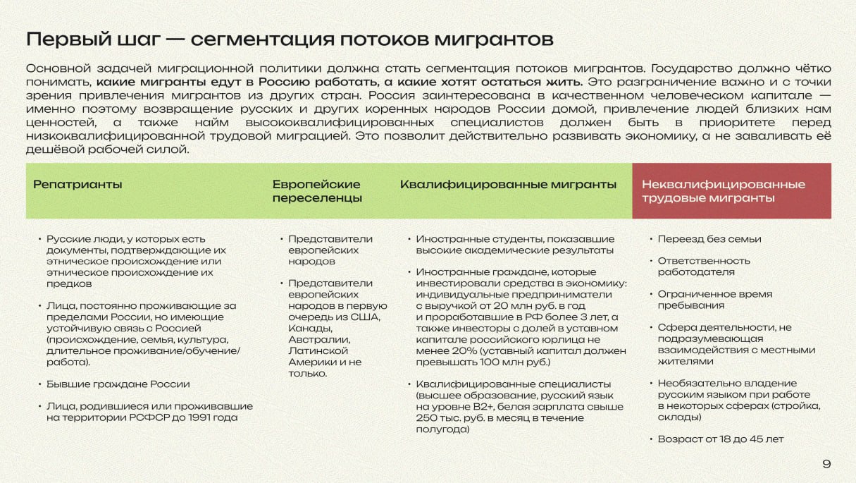 Главное — необходимо разделить миграционный потоки на трудовой и ассимиляционный. И они не должны пересекаться. Те, кто приезжают сюда работать, не должны идти по пути получения паспорта.
