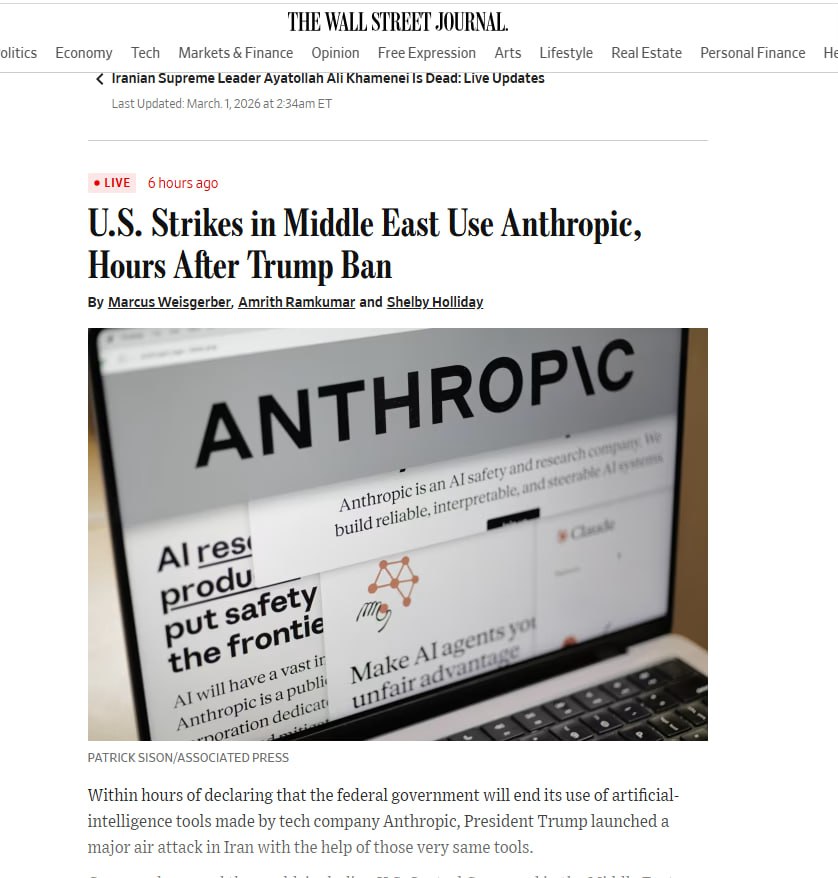 Согласно сообщениям Wall Street Journal, в ходе ударов США по Ирану использовалась нейросеть Claude компании Anthropic, причем всего через несколько часов после того, как Трамп запретил его использование.