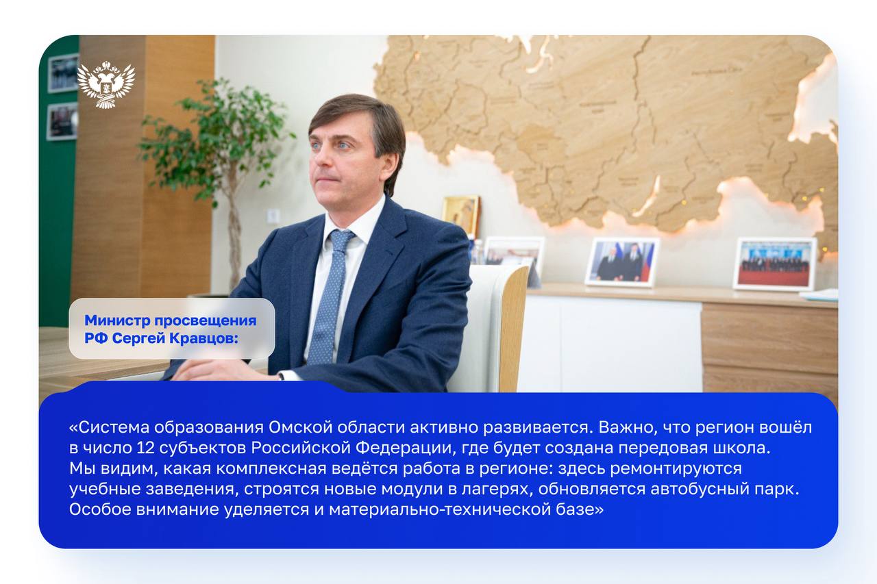 В ходе рабочей встречи министр просвещения РФ Сергей Кравцов обсудил вопросы обновления образовательной инфраструктуры региона с губернатором Омской области Виталием Хоценко.