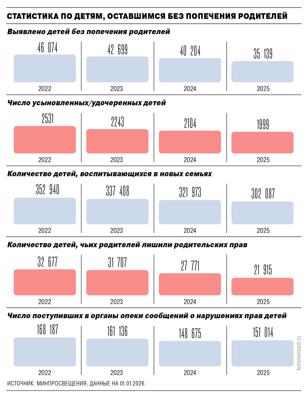 В 2025 году в России выявили 35 тыс. детей, оставшихся без попечения родителей, следует из данных Минпросвещения.