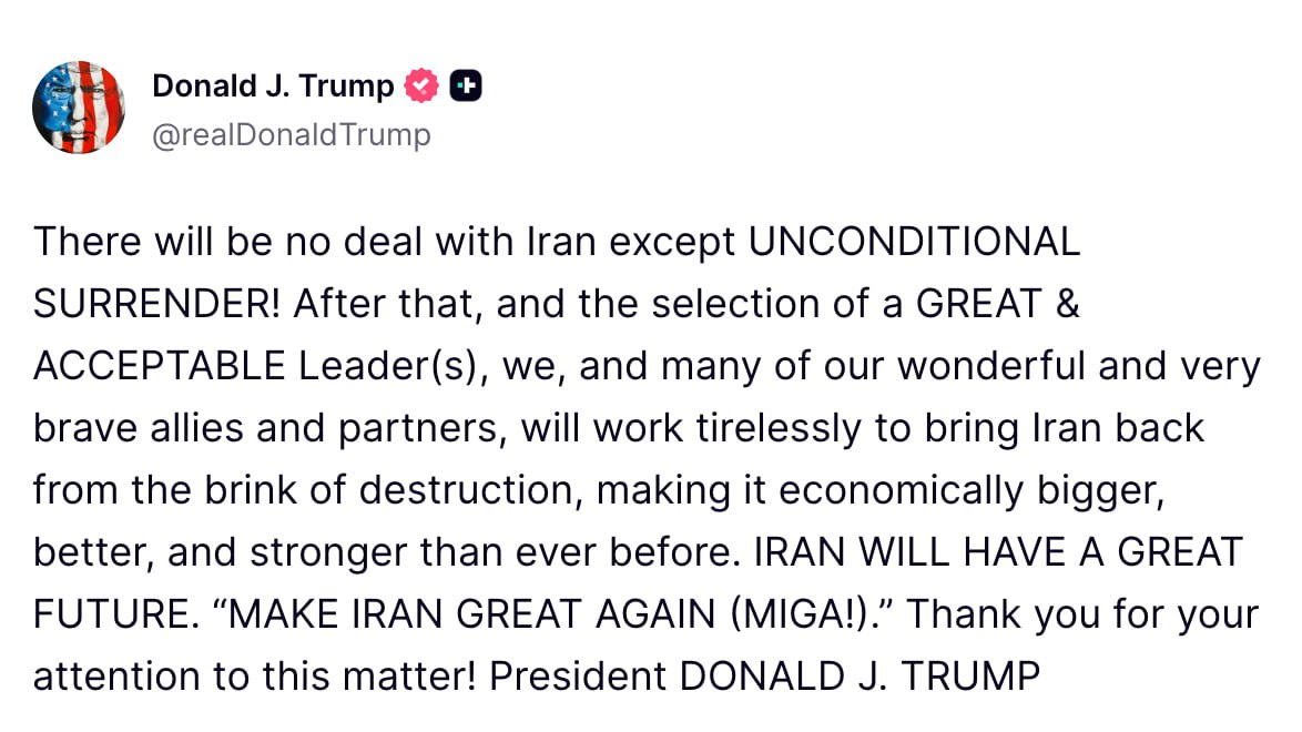 Дональд Трамп потребовал от Ирана «безоговорочной капитуляции». В соцсети Truth Social он написал, что не будет заключать никаких сделок с властями страны.