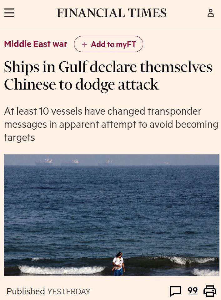 Пока дипломаты продолжают читать друг другу нотации о международном праве, в Персидском заливе включили режим театра абсурда. Как сообщает Financial Times, как минимум 10 судов выдавали себя за китайские, чтобы избежать атаки. Танкер ещё вчера был обычным анонимным перевозчиком нефти, а сегодня срочно переквалифицировался в условный «клон из Шанхая», потому что жить поддельным китайцем всё же безопаснее, чем настоящим собой.