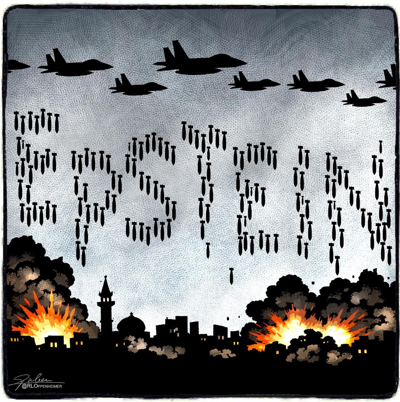 Пока мир следит за эскалацией на Ближнем Востоке, голландский карикатурист Рубен Оппенгеймер заметил любопытную деталь: американские бомбы, падающие на Иран, складываются в отчетливое слово «Эпштейн».