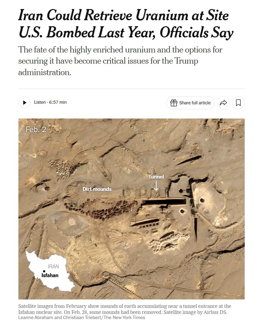 Источники издания утверждают, что у иранской стороны якобы появилась возможность проникнуть в помещения с ураном через узкий проход, образовавшийся в районе завалов. Отмечается, что этот запас радиоактивного металла может стать ключевым элементом, если Тегеран решит перейти к созданию ядерного оружия.