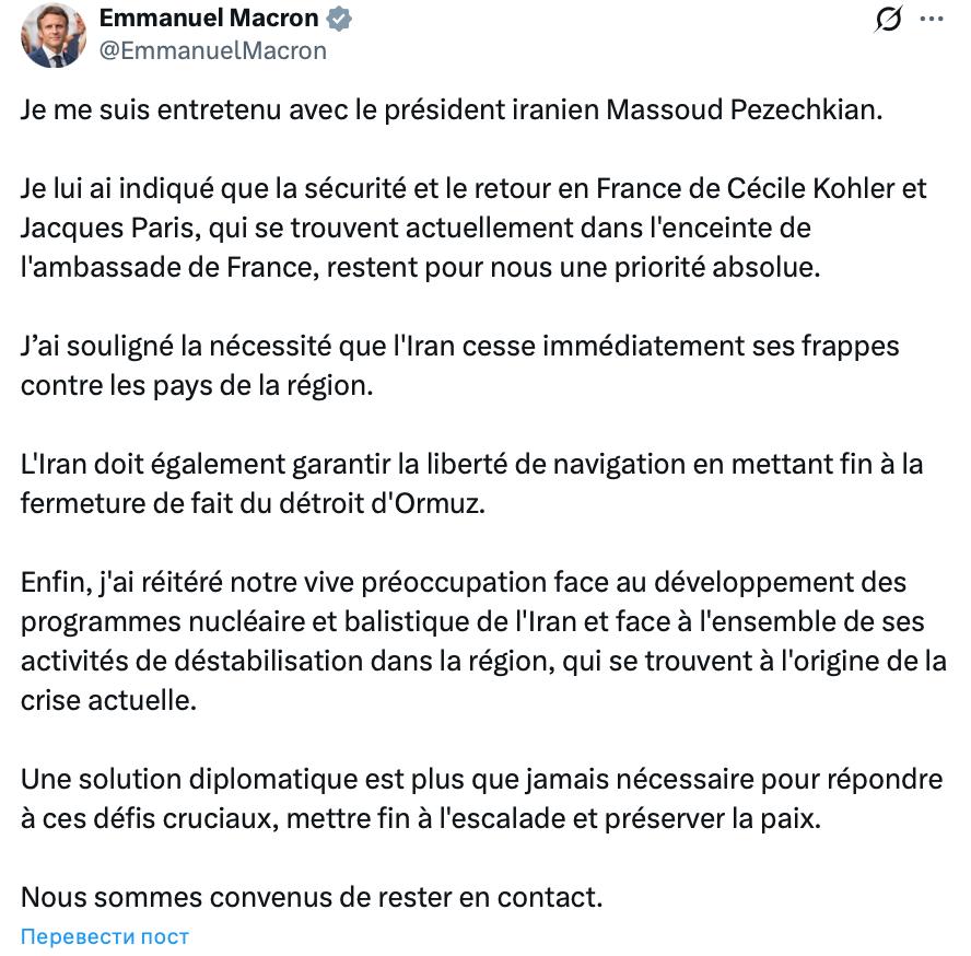 Французский лидер заявил о необходимости немедленного прекращения Ираном ударов по странам региона;