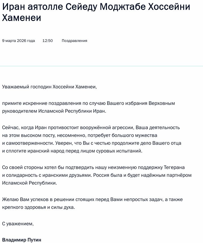 Путин направил поздравительную телеграмму аятолле Сейеду Моджтабе Хоссейни Хаменеи по случаю избрания Верховным руководителем Ирана.
