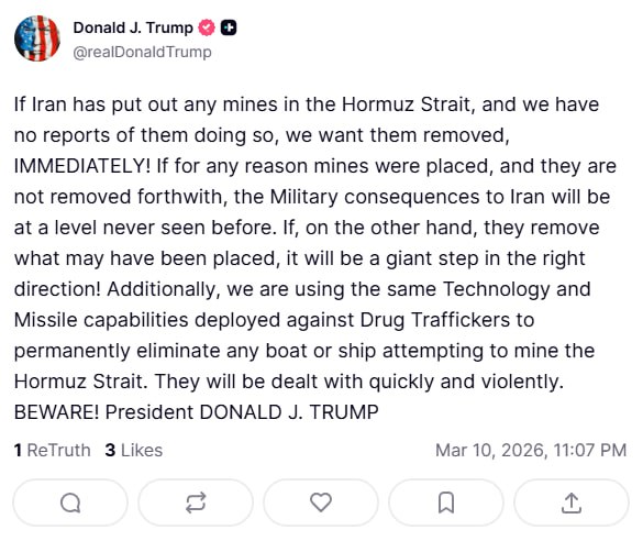 Трамп пригрозил Тегерану "беспрецедентными последствиями" за минирование Ормузского пролива, потребовав немедленного обезвреживания любых мин, которые могли быть установлены.