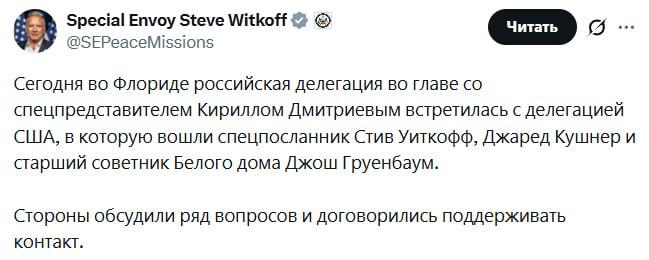 Переговоры США и России прошли во Флориде, заявил Уиткофф.