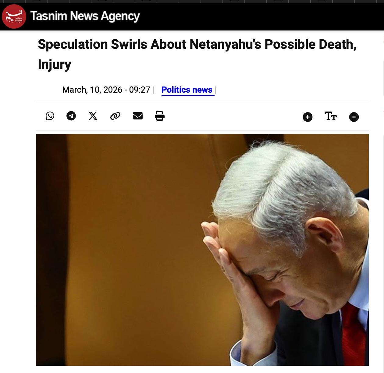 Иранское агентство Tasnim включилось в инфовойну: в источниках на иврите все чаще появляются предположения о возможной смерти или ранении премьер-министра Израиля.