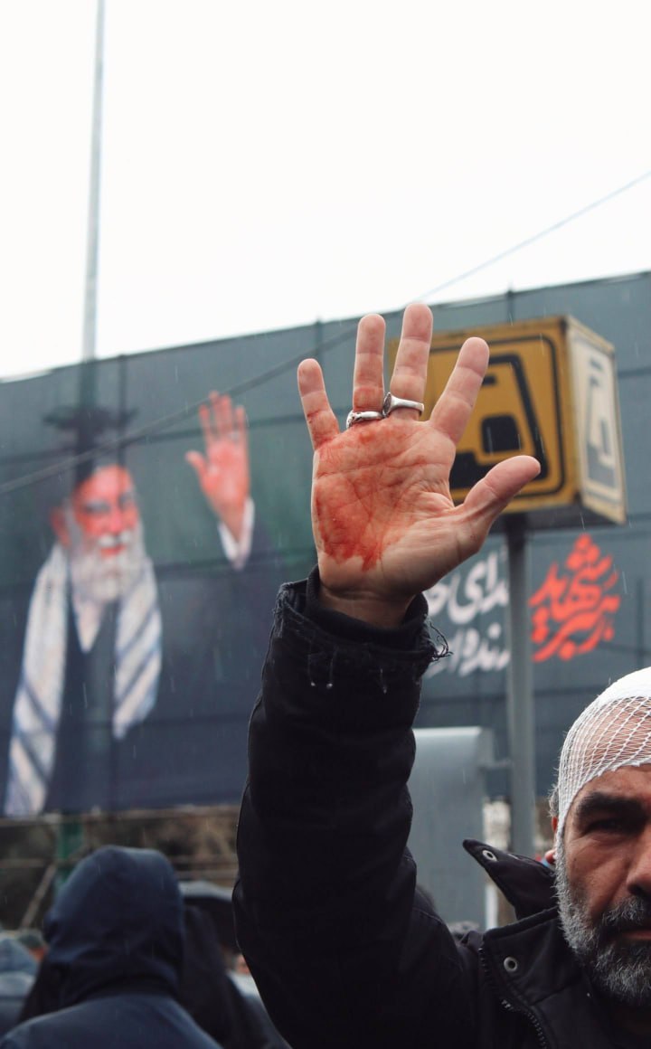 В кадре раненый иранец, который демонстрирует, как народ относится к злобным выпадам Америки.