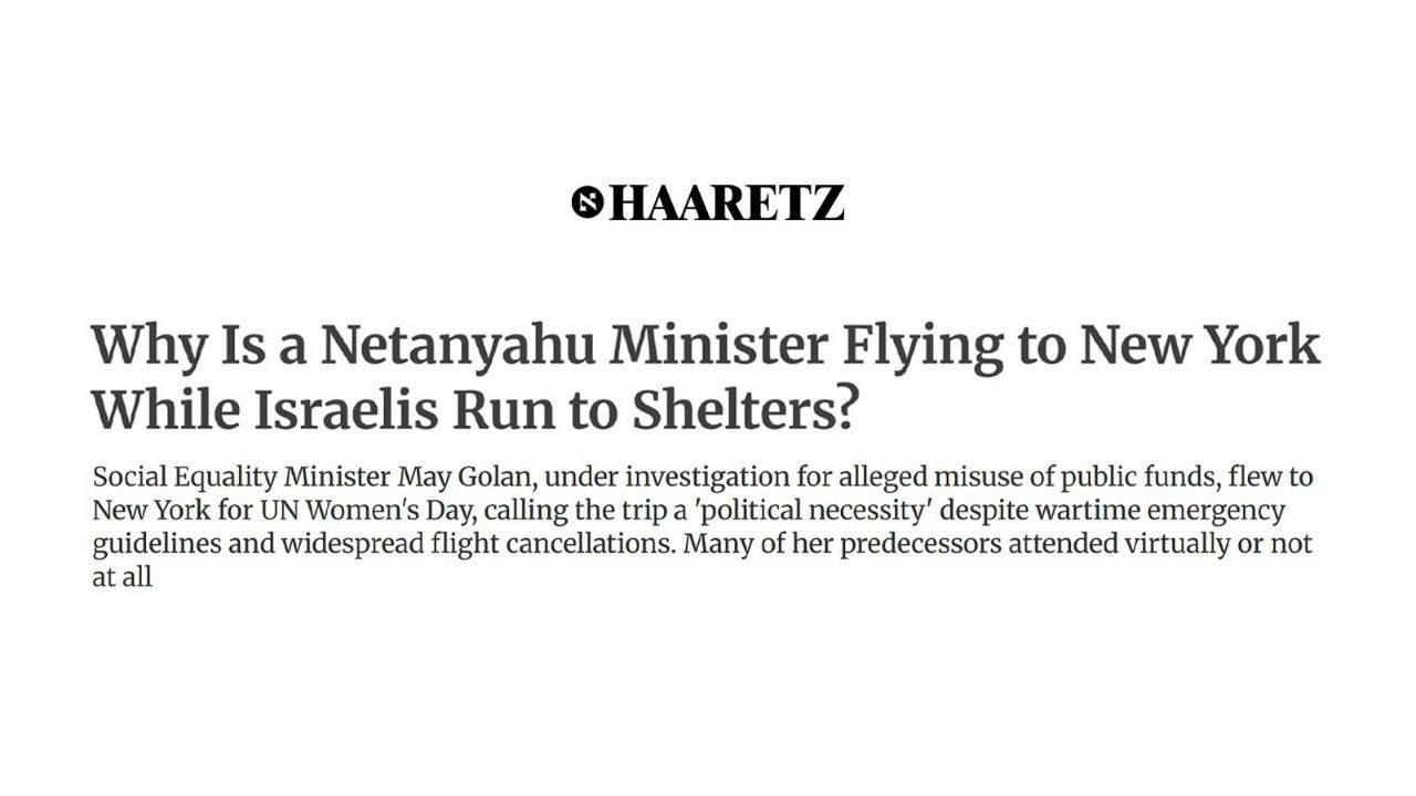 Сионистское издание Haaretz опубликовало материал, полный искреннего негодования. Оно задаётся вопросом, почему один из министров Нетаньяху едет в Нью-Йорк, пока израильтяне прячутся в убежищах.