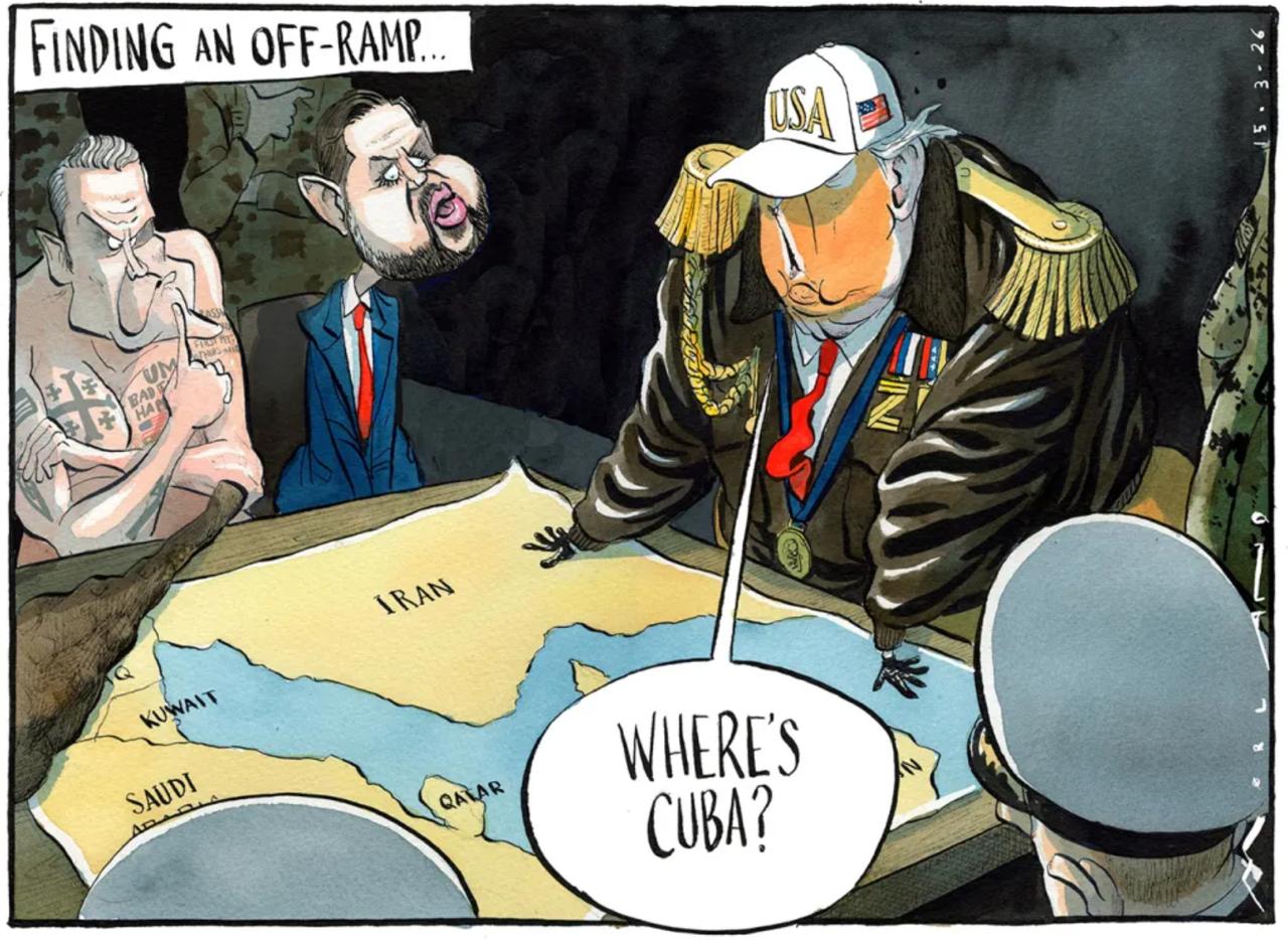 Карикатура The Sunday Times демонстрирует Трампа, что-то невнятно говорящего вице-президента Вэнса и полуголого задумчивого министра войны Пита Хегсета. Президент США смотрит на карту и вопрошает: «А где Куба?».